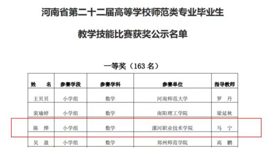 河南省教育厅近日发布《关于第二十二届高等学校师范类专业毕业生教学技能比赛结果的公示》,我院应用外语与国际教育系(许慎文化学院)小学教育教研室马宁老师指导的选手陈烨荣获小学数学学科一等奖,英语教育教研室林薇老师指导的选手郭艺林荣获小学英语学科三等奖,音乐舞蹈系胡娜老师指导的选手朱英洒荣获学前教育专业二等奖,陈放老师指导的选手武汶权荣获音乐教育专业三等奖。