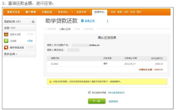 则还款支付宝账户和身份证号对应的贷款学生应还款本息会显示在页面中等待确认,还款信息确认无误后点击“下一步”进入收银台付款;