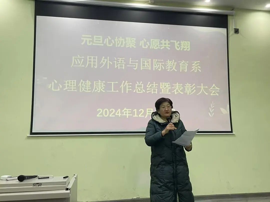 12月27日下午,应用外语与国际教育系在校心理健康教育中心举行2024年心理健康教育工作年终总结暨表彰大会,旨在总结2024年的心理工作,并对优秀心理委员、优秀宿舍安全信息员、宣传先进个人进行表彰和鼓励。党总支书记寇槐花、党总支副书记吕红梅、团总支书记袁海伟与各位辅导员老师出席活动。