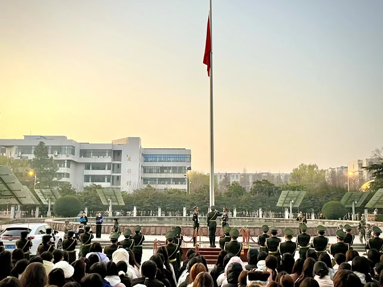 伴随着激昂的《义勇军进行曲》,五星红旗迎着晨光缓缓升起,全体师生肃立注目,行注目礼,爱国之情与民族自豪感在全体师生心中激荡。