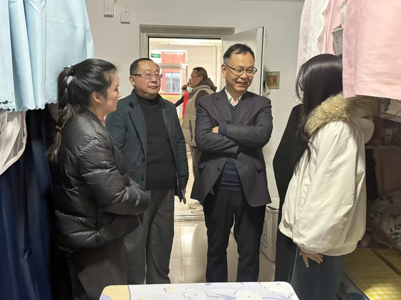 朱晓红一行走进学生宿舍,与同学们亲切交流,细致询问大家的住宿条件、冬季保暖情况以及学习生活中遇到的困难。在学生宿舍,领导老师们亲手将御寒物资递到学生手中,并反复叮嘱大家注意防寒保暖,科学安排作息时间,平时多与辅导员沟通交流,遇到困难及时向学院和学校反映。朱校长给同学们交谈中表示,学校始终将学生的成长发展放在首位,努力营造如家般温暖的校园环境,希望同学们安心学习、舒心生活,以积极乐观的心态迎接学习和生活中的各项挑战。