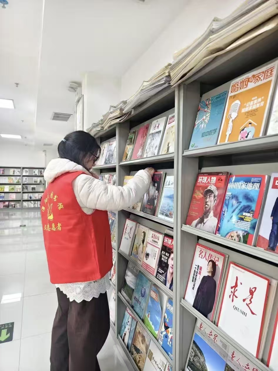 2025级英语教育专业学子彭怡繁走进家乡图书馆,开展志愿服务活动。她穿梭于书架之间,认真整理图书、引导读者借阅,协助开展少儿阅读活动、科普讲座组织工作,用实际行动营造浓郁书香氛围。在服务中提升了沟通表达与应急处理能力,更以青春活力点亮家乡文化服务阵地,让书香浸润家乡,用行动传递文化力量。