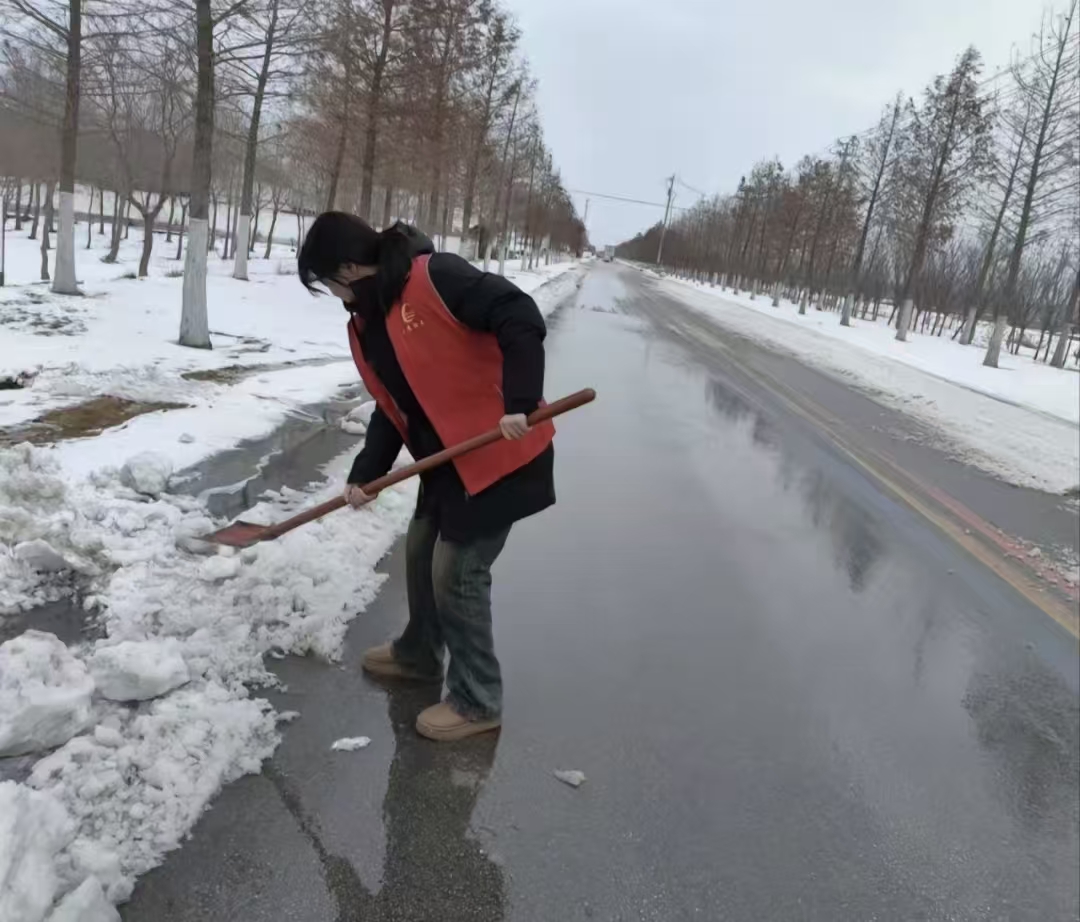 2025级商务英语专业学子张冉回到河南省安阳市安阳县,参与社区寒假“返家乡”实践活动。她身着红马甲,与社区工作人员共同清理道路积雪、排查安全隐患、开展禁燃禁放宣传、用实际行动为家乡群众的冬日出行保驾护航,用细致坚守筑牢基层安全防线,用汗水诠释青春奉献。