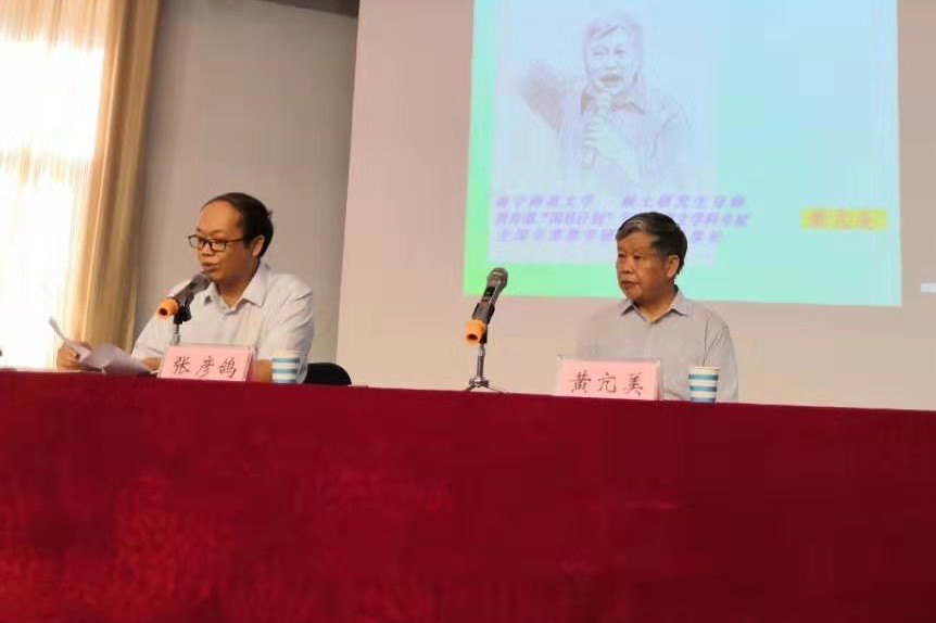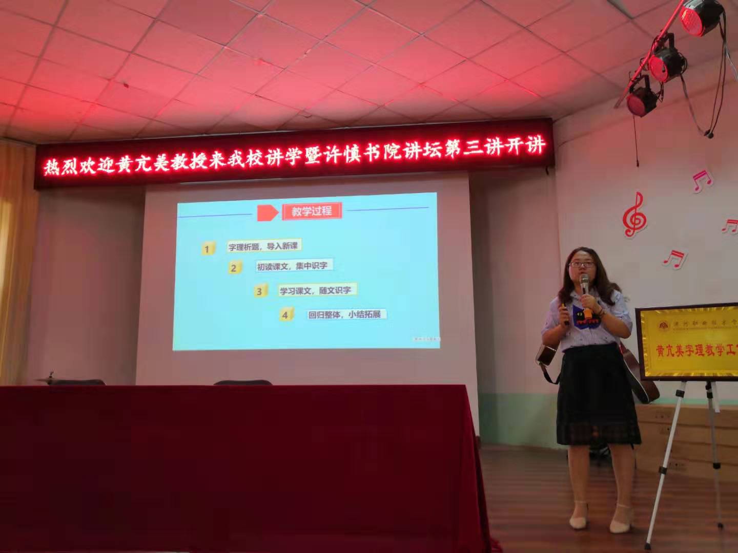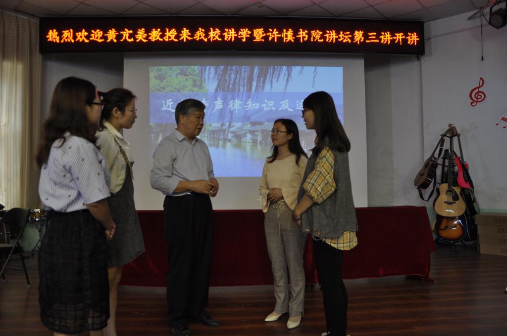 25日上午,黄亢美教授在我校音乐系小礼堂做了题为《格律诗、楹联知识及运用》的学术讲座暨许慎书院讲坛系列讲座的第三讲。黄亢美教授从格律诗的基本特征、章法、立意、取材、楹联知识及对联写作等方面进行讲解。下午我院黄亢美教授培养的首批弟子李珍珍、秦敏、王智丹老师就如何开展字理教学的学习与实践成果轮流开展汇报,黄亢美教授对三名青年教师字理教学取得的成绩进行了充分肯定,同时也指出了各自存在的不足和努力方向,提出了“小集中,大随文”的识字教学方式、 “图片选择要为识字服务”的观点。