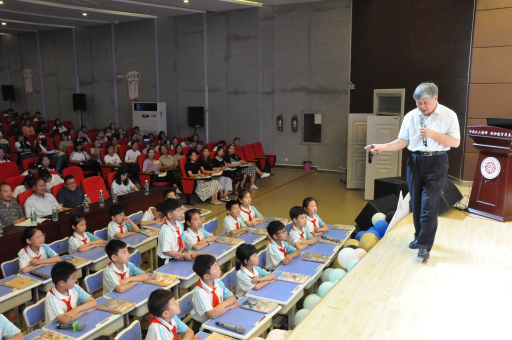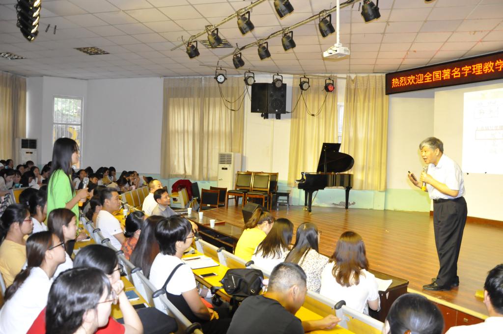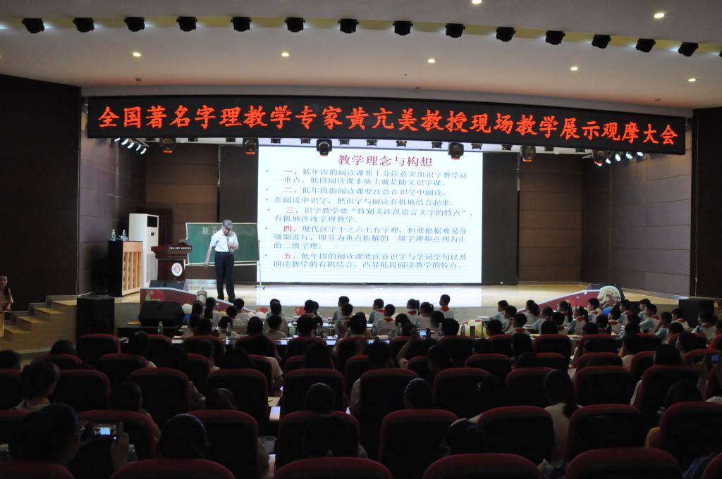 6月11日上午,我校邀请全国著名字理教学专家、广西师范学院研究员、硕士研究生导师、我校兼职教授黄亢美先生在北大附属实验学校大礼堂举行现场教学展示观摩大会。漯河北大附属实验学校小学部主任张景、教科处主任曹丽萍、太阳成tyc7111cc许慎文化学院副院长孟令超、党总支副书记吕红梅等学院领导班子成员、语文教育教研室全体教师、2017级语文教育、小学教育和2018级语文教育专业全体学生及北大附属实验学校小学部的部分教师和学生代表共400多人参加了此次现场教学观摩大会。此次观摩大会由许慎文化学院副院长孟令超主持。