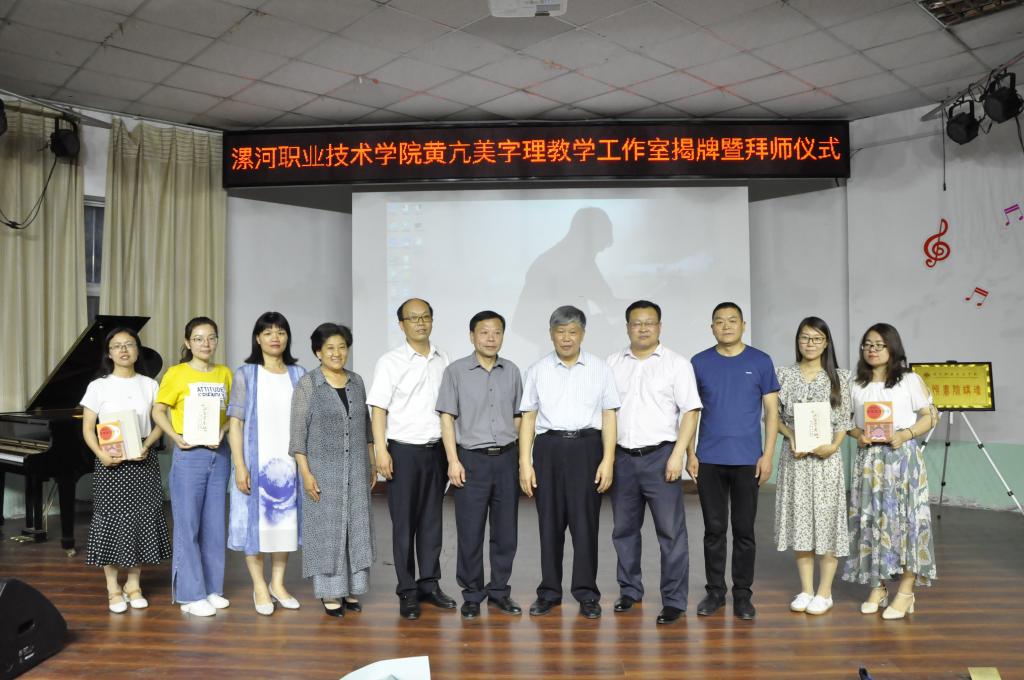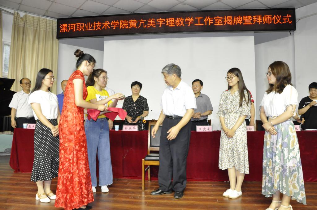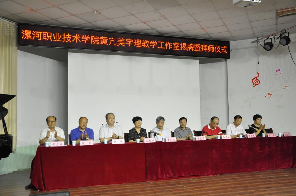 6月11日下午,我院在小礼堂举行黄亢美工作室揭牌仪式暨青年教师拜师仪式。太阳成tyc7111cc副校长王变奇、校工会主席吕爱华、组宣部部长易春林、人事处处长杨曦、教务处处长贾新政、校实验实训中心主任张勃、科研处处长长李杰、许慎文化学院院长张彦鸽、党总支书记寇槐花及许慎文化学院师生代表出席仪式。仪式由教务处处长贾新政主持。 学校工会主席吕爱华首先代表学校领导发表讲话,简要介绍了许慎文化学院的发展现状,高度评价黄亢美教授取得的教学科研学术成果,并强调指出在我校成立黄亢美字理教学工作室并举行弟子拜师仪式对我校许慎文化学院的专业建设和课程教学改革的重要意义。随后,副校长王变奇和黄亢美教授共同揭牌共同为黄亢美工作室揭牌。最后进行了弟子拜师仪式,许慎文化学院李珍珍、秦敏、孙晓芳、王智丹四位老师成为黄亢美教授的第一批弟子,四位弟子表示一定不辜负学校的期望和导师的栽培,虚心向导师学习,不断提升提高自身业务素质。