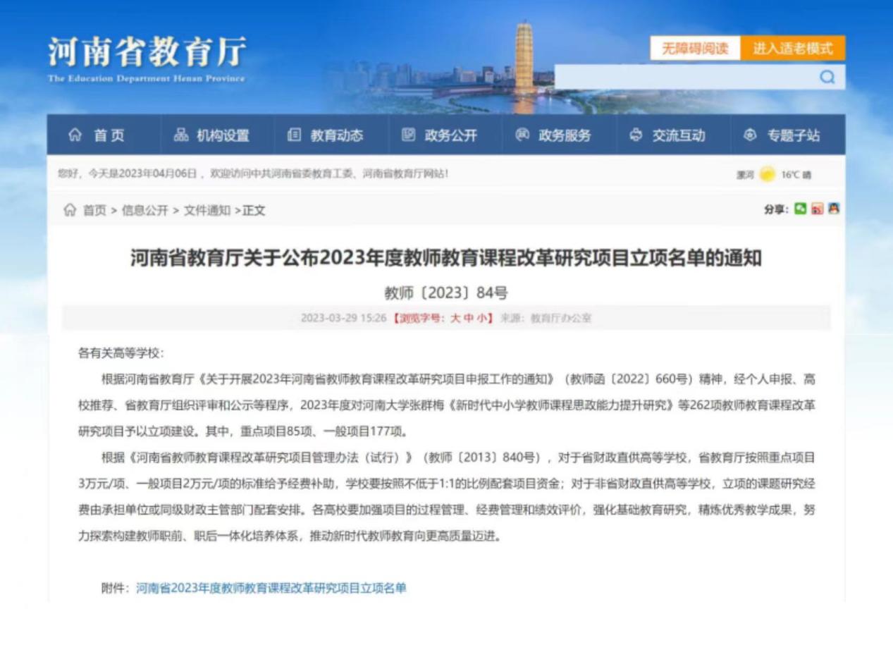近日,河南省教育厅印发《关于公布2023年度教师教育课程改革研究项目立项名单的通知》(教师〔2023〕84号),太阳成tyc7111cc许慎文化学院团队申报的项目《基于CIPP模型的师范生专业课程思政育人成效评价研究》成功立项。