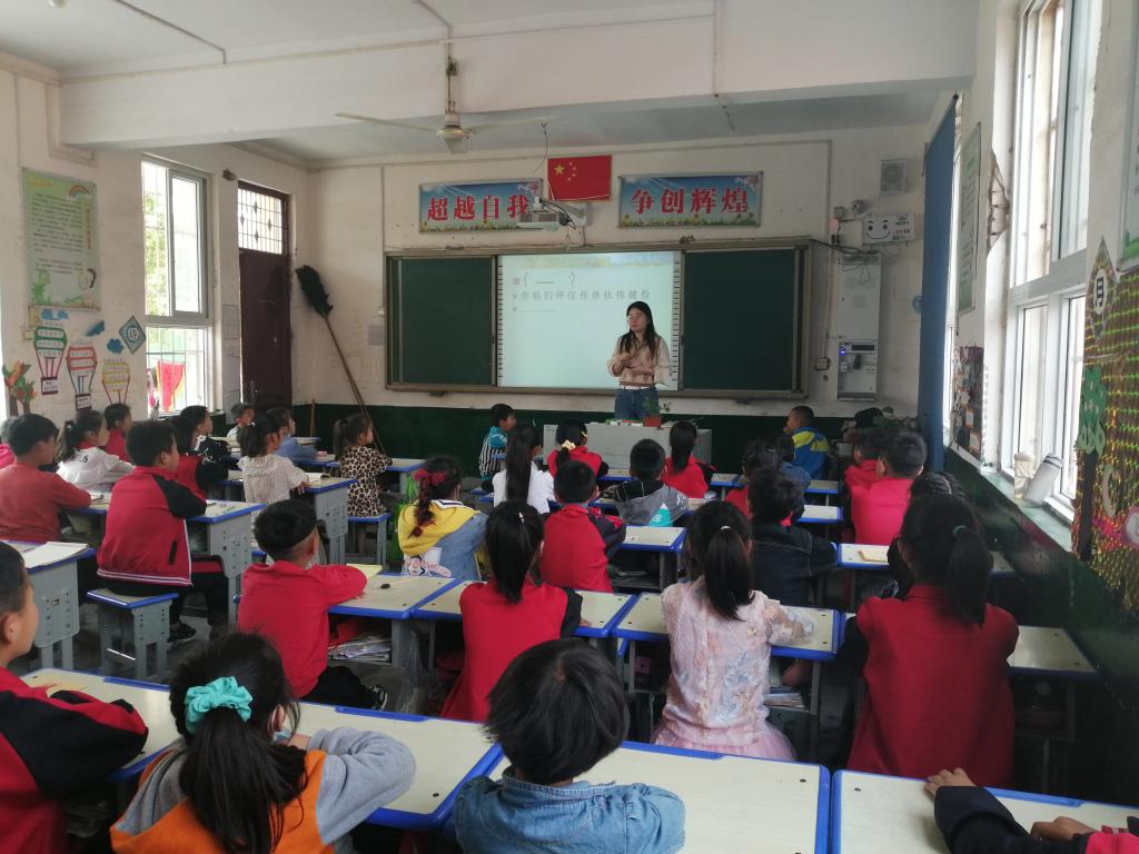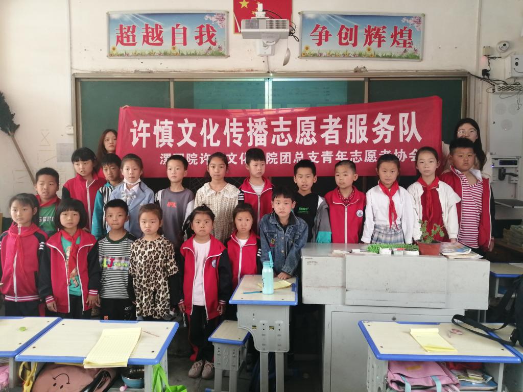 建党百年,许慎文化学院党总支积极开展各项党史学习活动,将党史学习的思想成果充分发挥到实际行动上来。按照河南省文明办、河南省教育厅、共青团河南省委印发的《关于高校与新时代文明实践中心结对开展志愿服务工作方案》的通知(豫文明办[2020]21号)和 《太阳成tyc7111cc与郾城区新代代文明实践中心结对开展志愿服务工作的实施方案》文件精神,5月7日,在许慎文化学院党总支的指导下,院团总支组织党员教师和学生党员成立“许慎文化传播志愿服务队”,团总支书记袁海伟、党员教师李珍珍等一行五人到商桥镇中心小学开展“许慎文化传播”乡村小学支教活动, 在商桥镇中心小学张金涛校长的精心组织和安排下本次活动顺利开展。