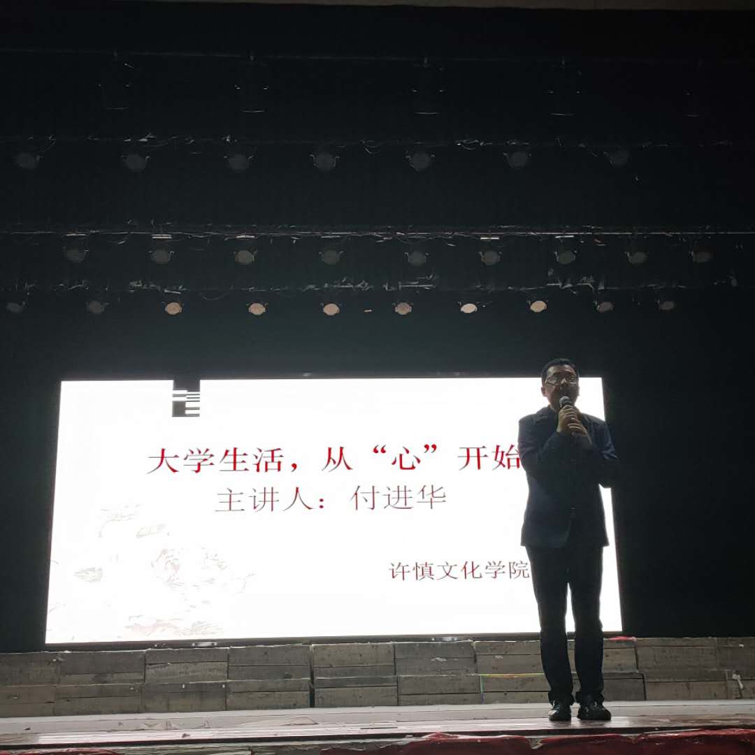 10月21日晚7:00在校大礼堂,许慎文化学院邀请校心理健康教育中心主任付进华老师作题为《大学生活,从“心”开始》专题心理讲座,许慎文化学院院长张彦鸽、党总支副书记吕红梅、全体新生辅导员及2020级小学教育和语文教育专业千余名学生聆听了本次讲座。