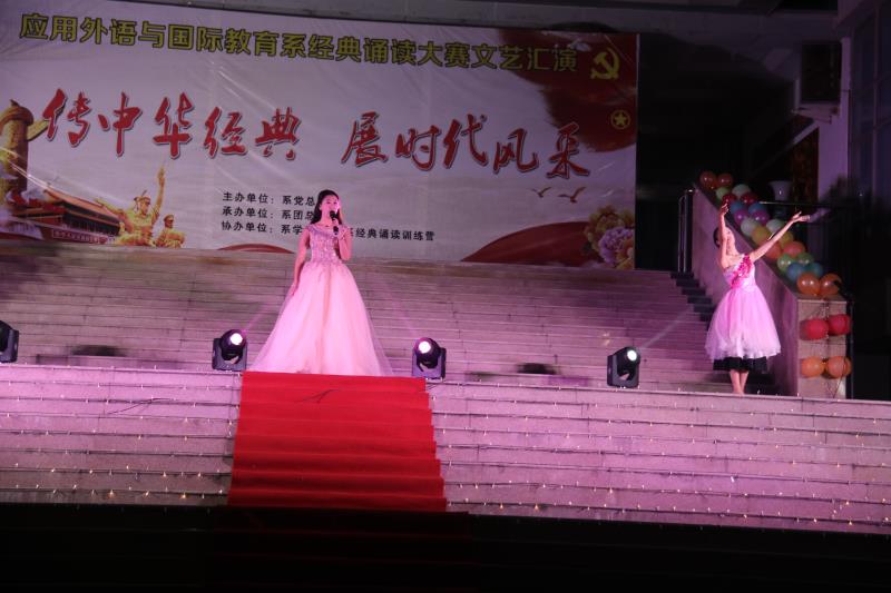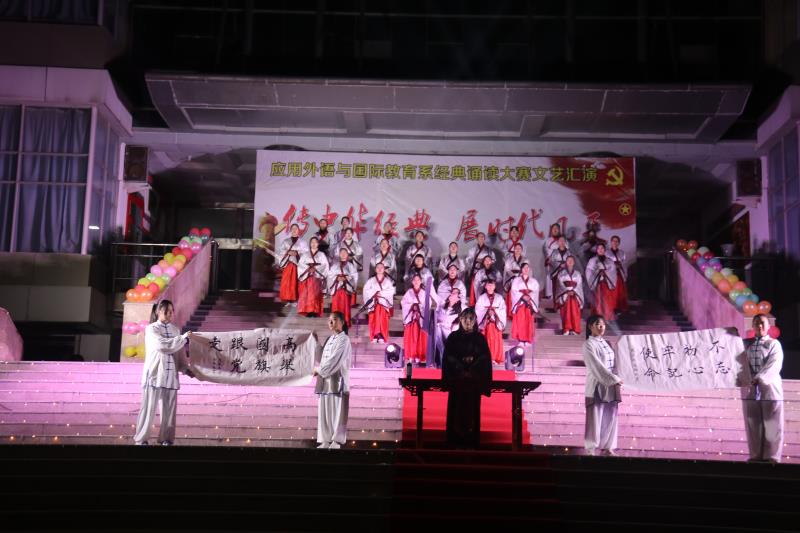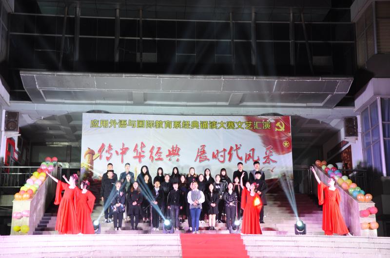 11月23日晚应用外语与国际教育系团总支在实训广场举行“经典诵读大赛”文艺汇演。院团委书记周茜应邀莅临现场,应用外语与国际教育系党总支书记寇槐花、系团总支书记袁海伟、各教研室主任、系全体教职工,2018级和2017级全体学生以及各兄弟系部代表观看了演出。