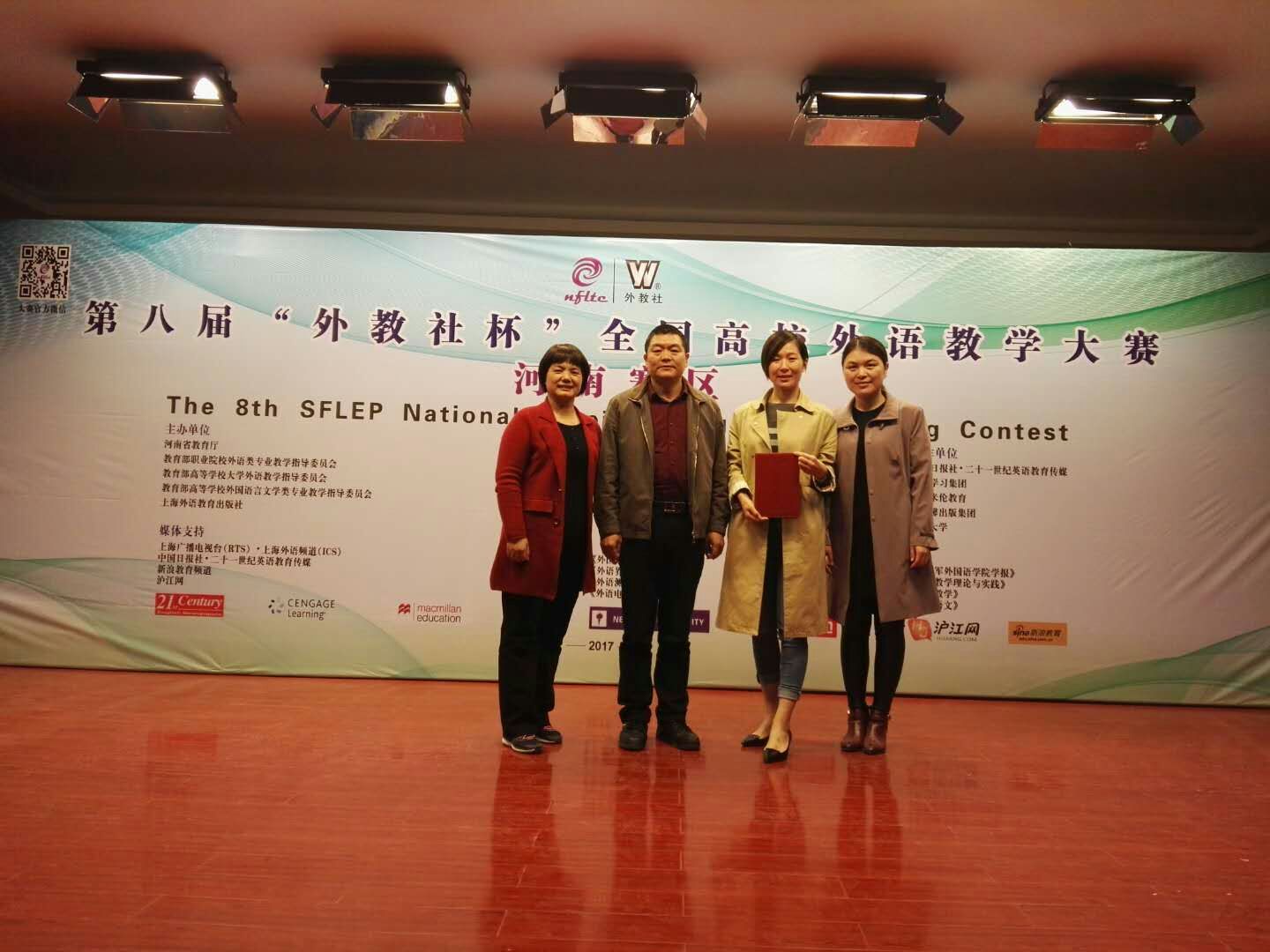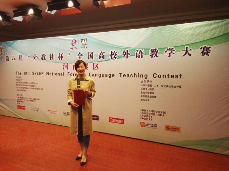10月14-15日,第八届“外研社杯”高校教学技能大赛(高职组)河南省赛区复赛和决赛在开封大学举行。全省41所高职院校经过初赛推荐的41名选手参加复赛和决赛。经过激烈角逐,产生了大赛一等奖四名,二等奖8名,三等奖16名。代表我院参赛的应用外语与国际教育系青年教师罗霞老师荣获本届大赛河南省赛区决赛二等奖。