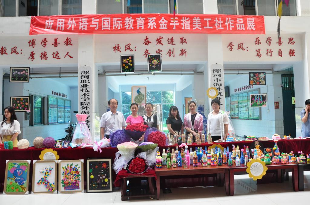 2017年5月25日上午8:30,为期三天的应用外语与国际教育系金手指美工社“惜夏.收获”手工作品展在三号教学楼一楼大厅举行。学院党委书记顾文明、副院长朱晓红、王变奇、代骅等院领导及教务处、学生处、科研处、团委、实训中心部等处室领导在系主任张彦鸽、系党总支书记田玉枝等领导班子成员陪同下观看展览作品,并对作品给予了高度评价。应用外语与国际教育系全体师生、兄弟系部2000余名师生参加观摩。
