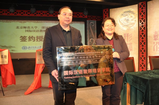 签约揭牌、授牌仪式由副市长栗社臣主持,市政协主席张社魁致辞,双方代表为研究基地和留学生教育实践基地揭牌;李凤林书记与顾文明院长代表双方签订合作举办国际汉语教师培训学院的协议,李凤林为国际汉语教师培训学院授牌。
