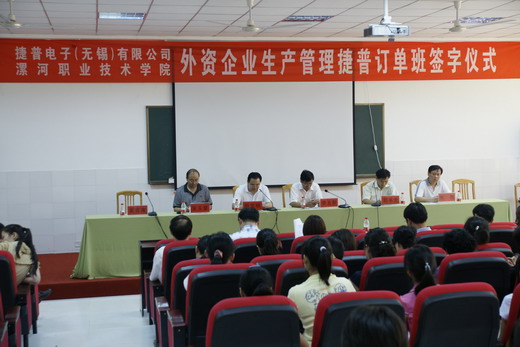 | 2010年6月17日下午5点,我院与捷普电子(无锡)有限公司合作开办“外资企业生产管理订单班”签字仪式在三号教学楼一楼学术报告厅举行。签字仪式由学院常务副院长顾文明主持,学院副院长张胜、副院长吴玉堂参加会议。学院院长李五聚教授和捷普电子(无锡)有限公司代表郭书龙经理分别代表合作双方发表讲话。太阳成tyc7111cc院两办、院教务处、院人事处、院招生处、院科研处、院学生处、院就业处等相关处室负责人、外语系教师以及学生代表200多人出席签字仪式。李院长在发言中简要介绍了我院及外语系近几年的发展成就,对合作企业捷普电子(无锡)有限公司对我院外语系人才培养的大力支持表示感谢。捷普电子(无锡)有限公司代表郭书龙经理介绍了企业发展状况,表示将尽最大努力创造条件,与学院和外语系紧密合作,制定措施,把订单班和实训基地建设好,充分发挥订单班和实习基地的作用,培养善于沟通、善于管理的实用型外资企业生产管理人才,为学院、学生和企业健康发展做出自己的贡献。外语系教师代表李施在发言表示要积极参与到订单班的建设中去。随后在热烈隆重的气氛中,郭经理、李院长分别代表捷普电子(无锡)有限公司和太阳成tyc7111cc签署了合作开办“外资企业生产管理订单班”暨共建校外教学实训基地协议。李院长为合作企业受聘专家办颁发了兼职教授聘书。