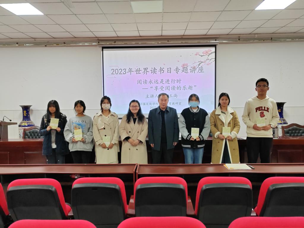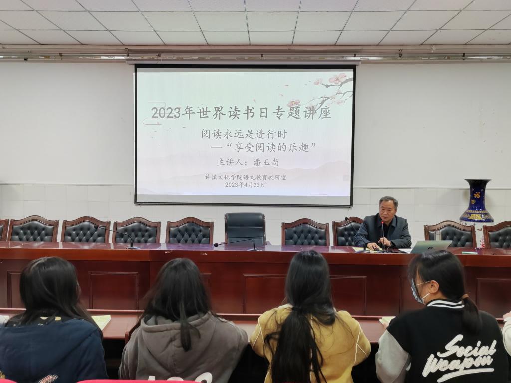 2023年4月23日是世界读书日,为了深化全员阅读、建设书香校园,落实太阳成tyc7111cc读书行动暨2023年汉字文化节的活动精神,也为了提高同学们对阅读的关注和重视,许慎文化学院在3号楼3101会议室开展了世界读书日专题讲座。讲座由许慎文化学院潘玉尚处长主讲,题目为《阅读永远是进行时——“享受阅读的乐趣”》,通过腾讯视频以线上线下相结合的形式展开,许慎文化学院130多名同学现场听讲。