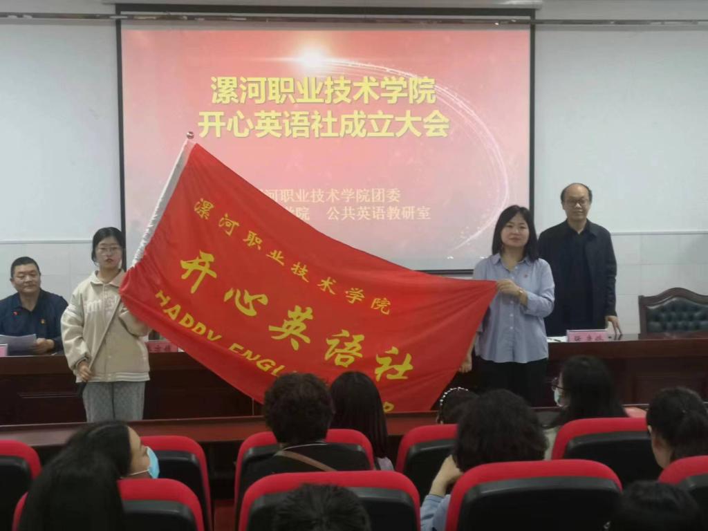 校团委办公室主任李方媛为开心英语社授旗