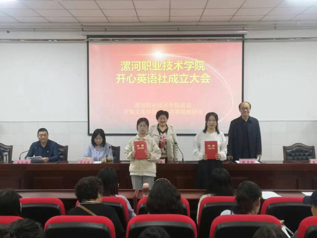 系党总支书记寇槐花为开心英语社社长石萌同学颁发聘书;张彦鸽主任为指导教师杨雪颁发聘书
