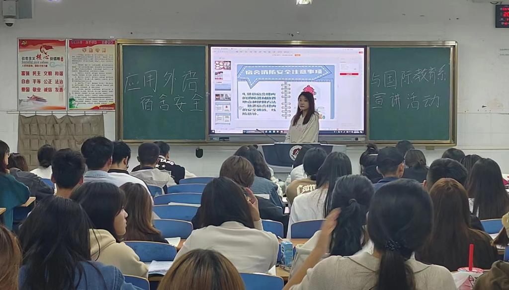 为进一步加强新生的宿舍安全意识,提高自我管理能力,在应用外语与国际教育系党总支的指导下,系宿管委学生干部于10月10日晚7:30在三号楼晚自习教室分别给2023级500名新生开展“新生宿舍安全知识普及”宣讲活动。