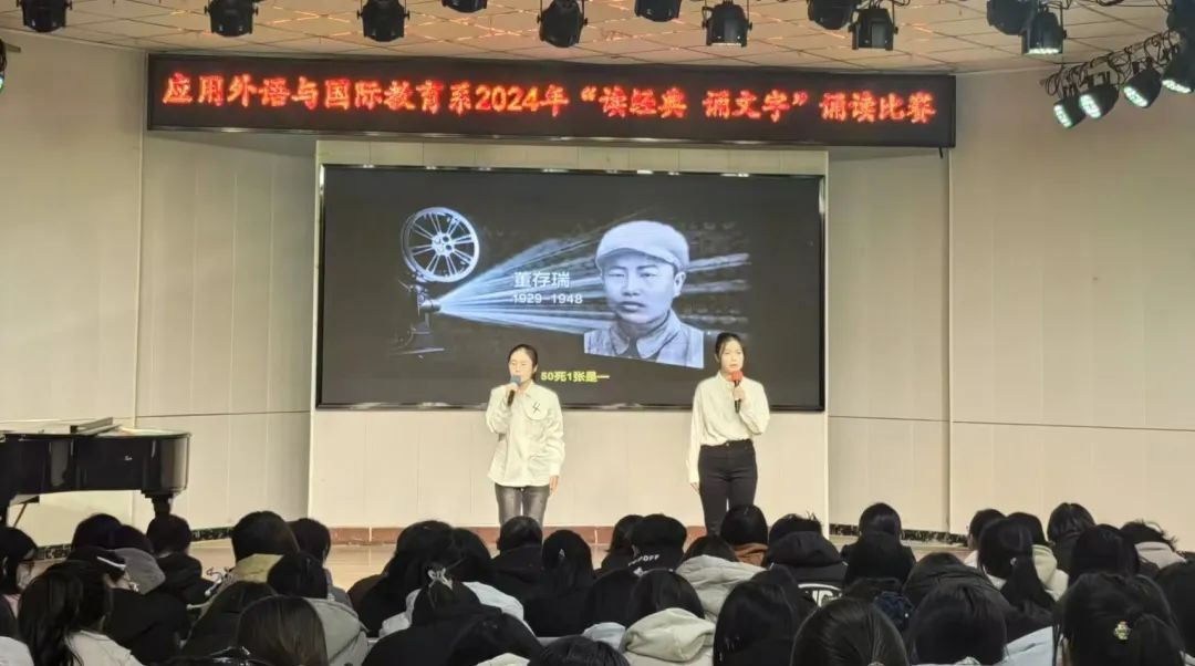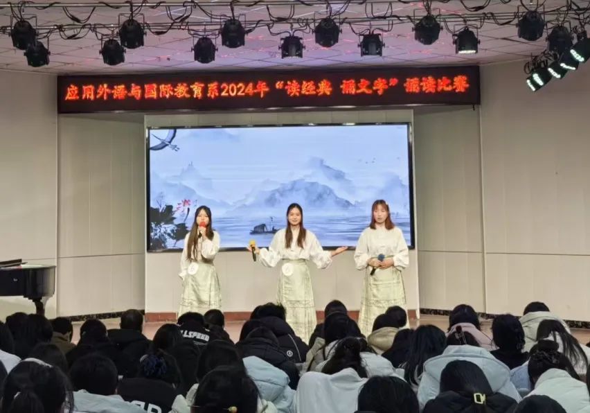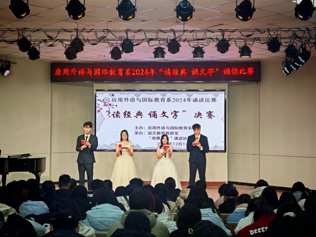 12月12日晚,应用外语与国际教育系在学校音乐系小礼堂隆重举办了“读经典 诵文字”诵读比赛决赛。此次活动旨在通过诵读经典,激发学生对文学的兴趣,提高语言运用能力,加深对中华优秀传统文化的理解和认同。应用外语与国际教育系副主任孟令超、党总支副书记吕红梅、团总支书记袁海伟出席了本次活动,2024级全体同学及2023级学生代表现场观赛。大赛邀请了语文教育教研室的宋琦、王智丹、梁仲瑜、赵鑫彦、李镕岐等五位老师担任评委。
