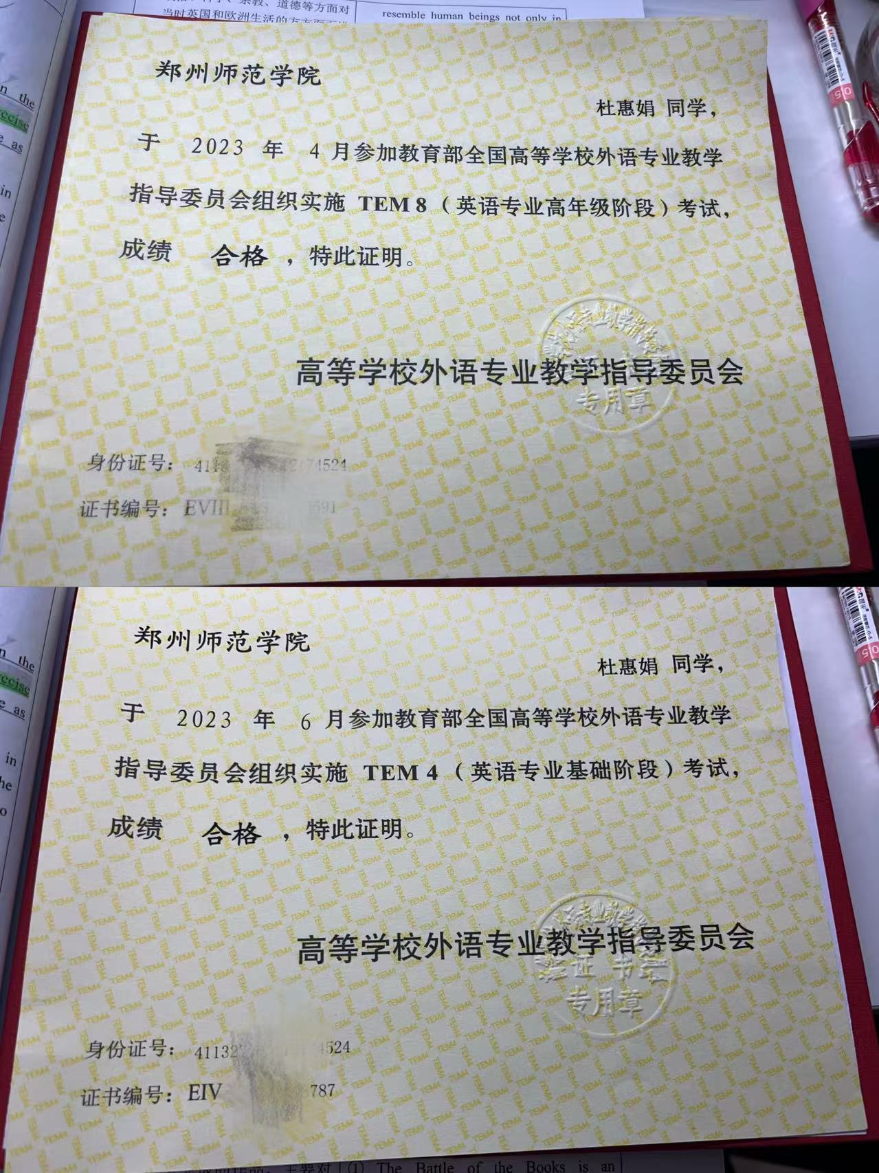 本科阶段,她顺利通过英语专业四级和专业八级考试,为自己的专业能力打下了坚实的基础。此外,她还考取了高中英语教师资格证,朝着优秀教师的梦想稳步迈进。