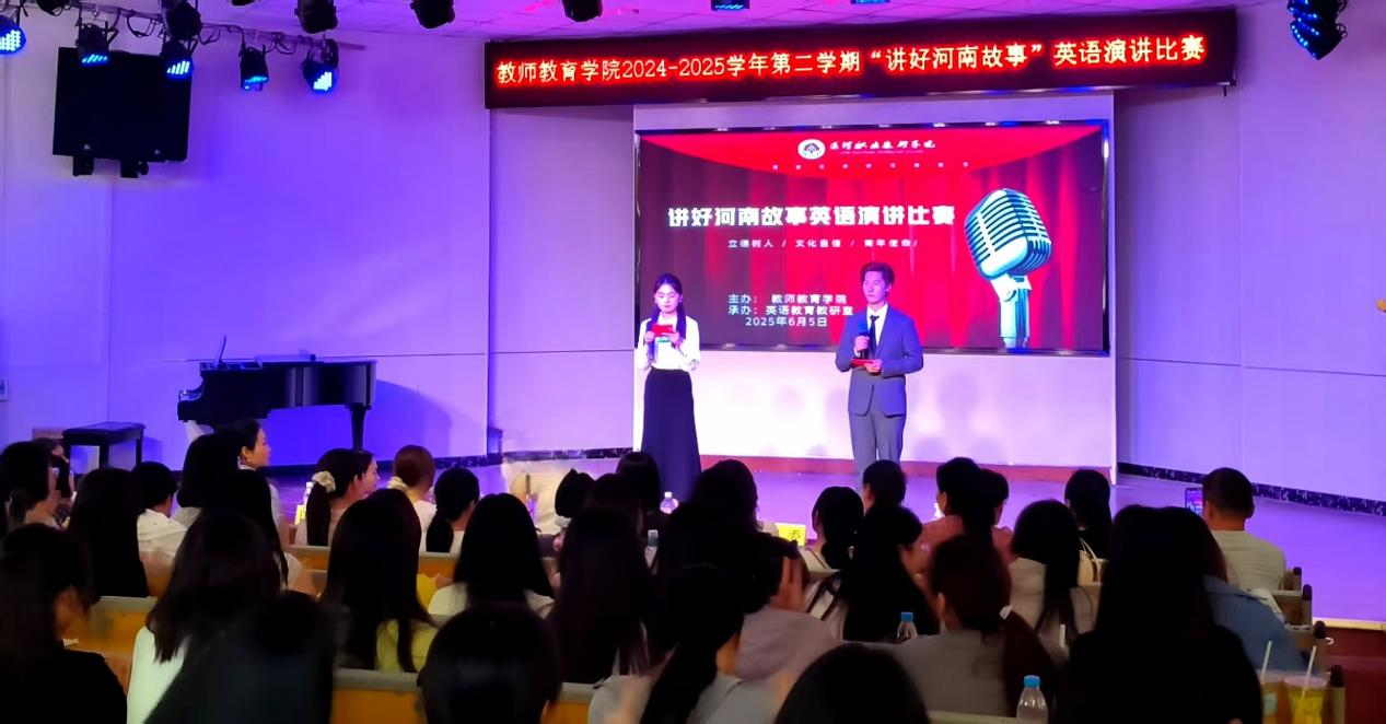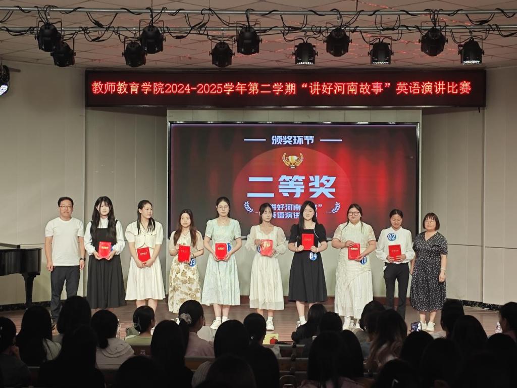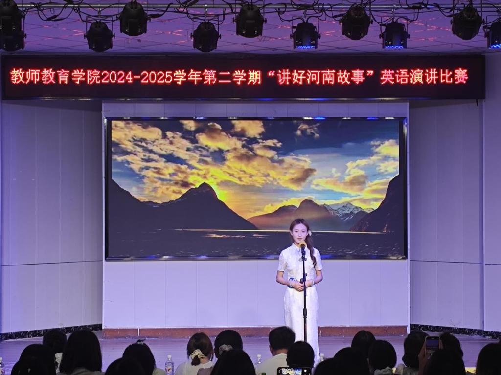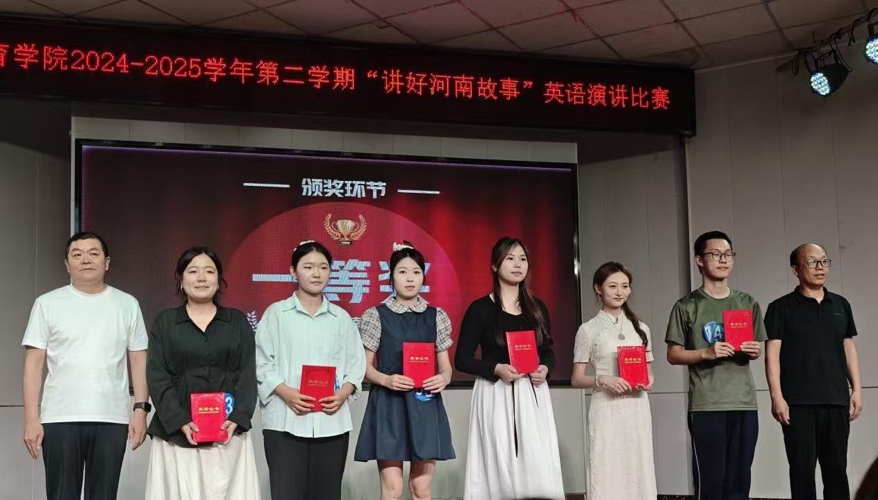 大赛虽已落幕,余音犹在回响。本次比赛是我校英语教学成果的生动检阅,既是落实立德树人根本任务的生动实践,更在跨语际传播中筑牢学子文化自信根基。当岳飞精忠报国的呐喊穿透英语语境,当胡辣汤的烟火温度传递青年的心声,当河南的古老传说与现代传奇被青年学子们用英语深情讲述,他们正以青春之声践行文化使命,让河南这张承载五千年文明基因的“金色名片”在立德树人与自信传承中绽放璀璨光芒。
