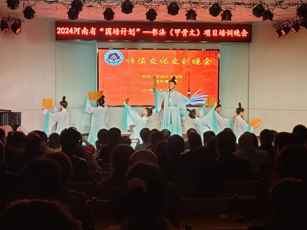 许慎文化学院联合音乐舞蹈系共同为此次国培项目筹办了一场精彩纷呈的文创晚会。乘着悠扬歌声,伴着经典诵读,在座师生共赴一场文化盛宴。深入古汉字雕刻的时代殿堂,品味岁月流逝酿造出的绵绵情思,感悟中华文化展现出的永久魅力。