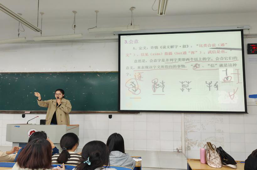讲座上半场,赵鑫彦老师从汉字形体结构入手,讲解关于六书的理论知识,同时结合具体字例,通过分析汉字的古文字形体,让师生们清晰地理解六书的知识,让他们体会许慎通过六书传达给我们的汉字的魅力。