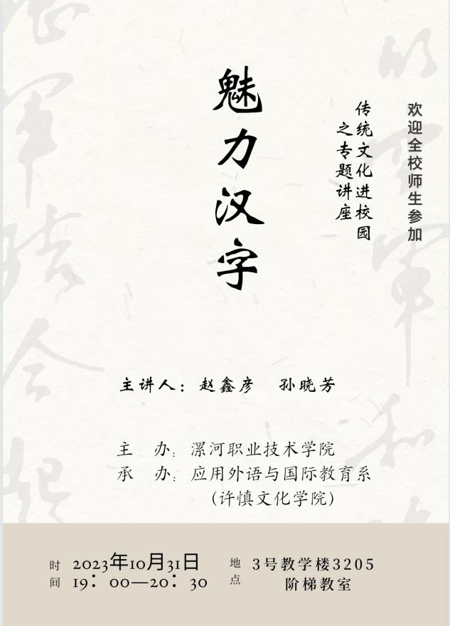 每一个汉字都承载着特定的文化信息。两位老师表示,希望通过本次交流,能够在今天参加讲座的师生心里“种下一颗种子”,当他们真正看到熟悉的汉字时,就会想到这场讲座中的细节,感受汉字的魅力,由内而外产生一种文化自信,递出漯河的文化新名片,真正做到弘扬许慎精神,传承汉字文化。通过两位老师的讲授,广大师生收获颇丰,不仅见证了汉字的生命力,对汉字文化及其展现出的魅力也有了更深的感悟。本次讲座收到了预期效果。