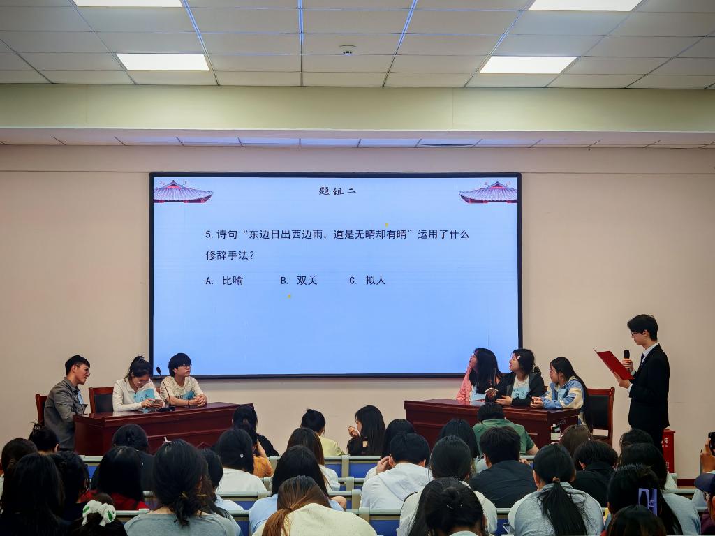 活动伊始,便是激动人心的“百舸争流”抢答环节。参赛者为初赛脱颖而出的18位选手,分成六队,两两PK。他们犹如矫健的龙舟,竞逐于诗词的江河,在知识的浪尖上激流勇进,他们奋勇而自信,展现着诗行之间的无尽活力。